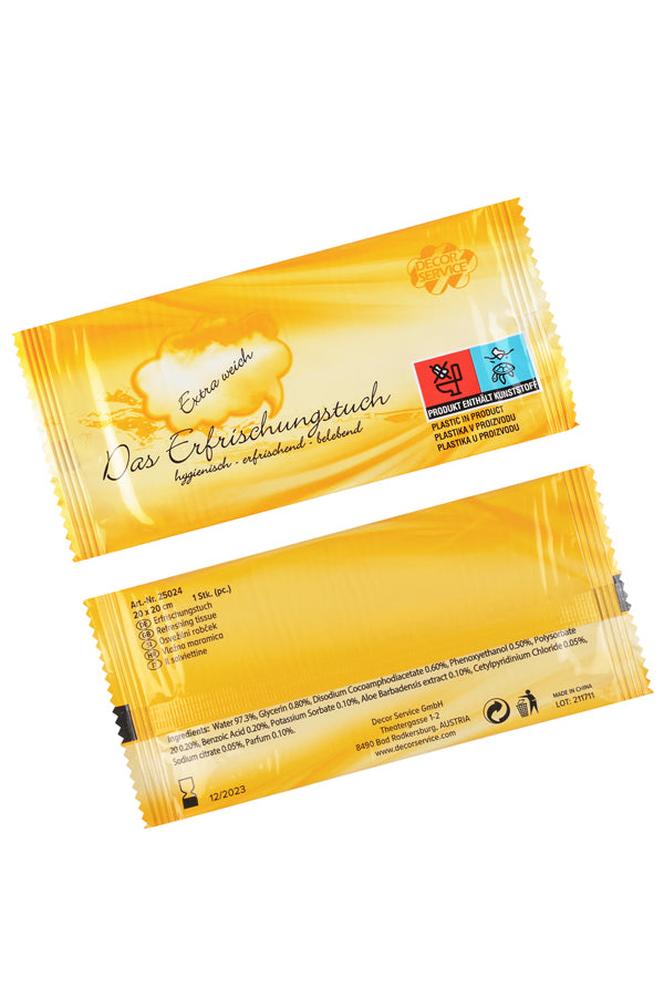 - Eigenschaften: hygienisch, sanft, erfrischend und belebend mit Zitronenduft. Getränkte Erfrischungstücher - aus extra saugfähigen Fasern, besonders reißfest, als idealer Frischekick für Zwischendurch zur praktischen und schnellen Einzelentnahme.